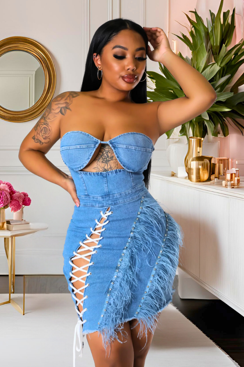Turn every entrance into a moment with the Feather Play Denim Dress. This semi-stretch strapless mini is all about bold energy—featuring a structured sweetheart neckline, edgy front cutout with lace-up detailing, and luxe faux feather accents trimmed with rhinestones for the ultimate glam finish. The sculpted fit hugs your curves, while the zipper closure ensures a snatched silhouette that doesn’t compromise on comfort.