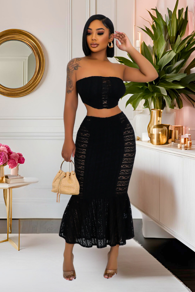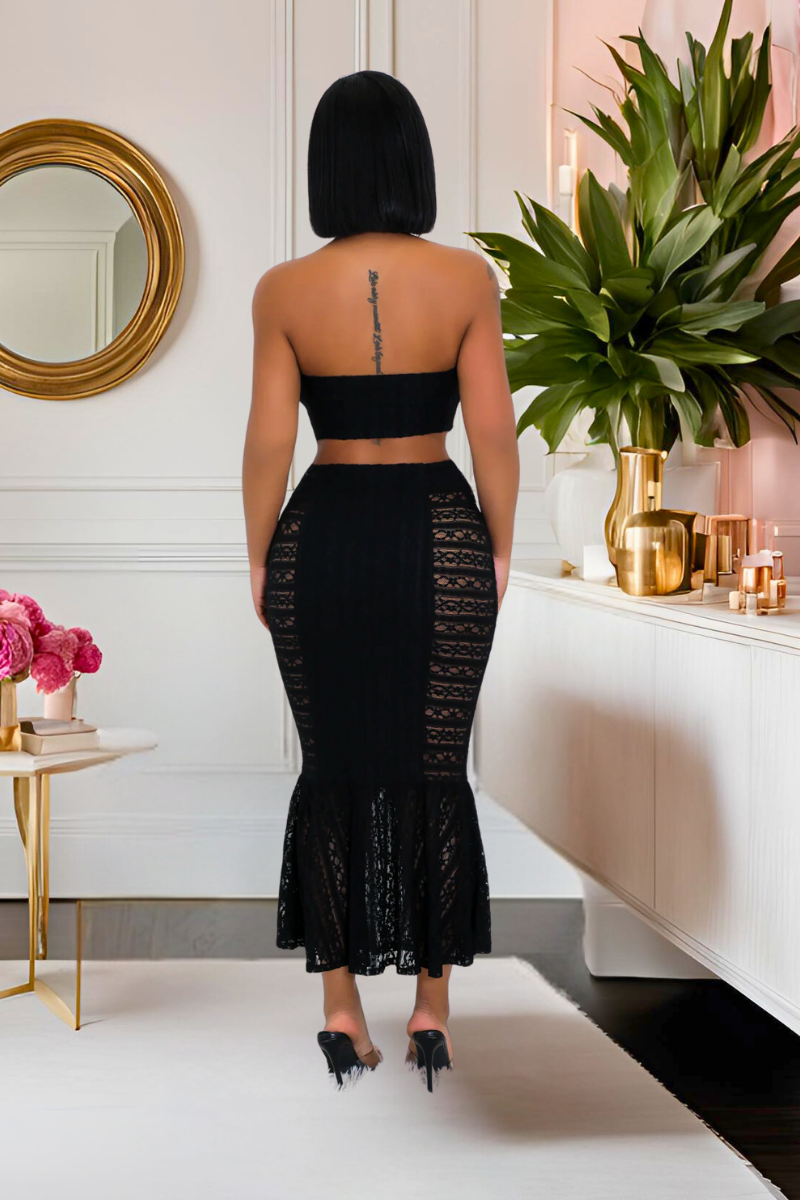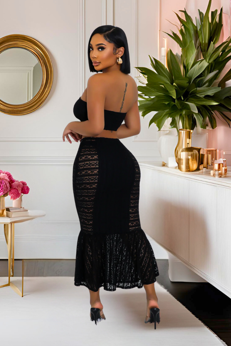 Make a captivating entrance with the Midnight Siren Set—a black lace two-piece made to turn heads and hug every curve. This strapless crop top pairs perfectly with a high-waisted, body-hugging skirt featuring sheer lace paneling and a flirty fishtail hem. It’s the ultimate statement for candlelit dinners, rooftop soirées, or wherever glam belongs.
