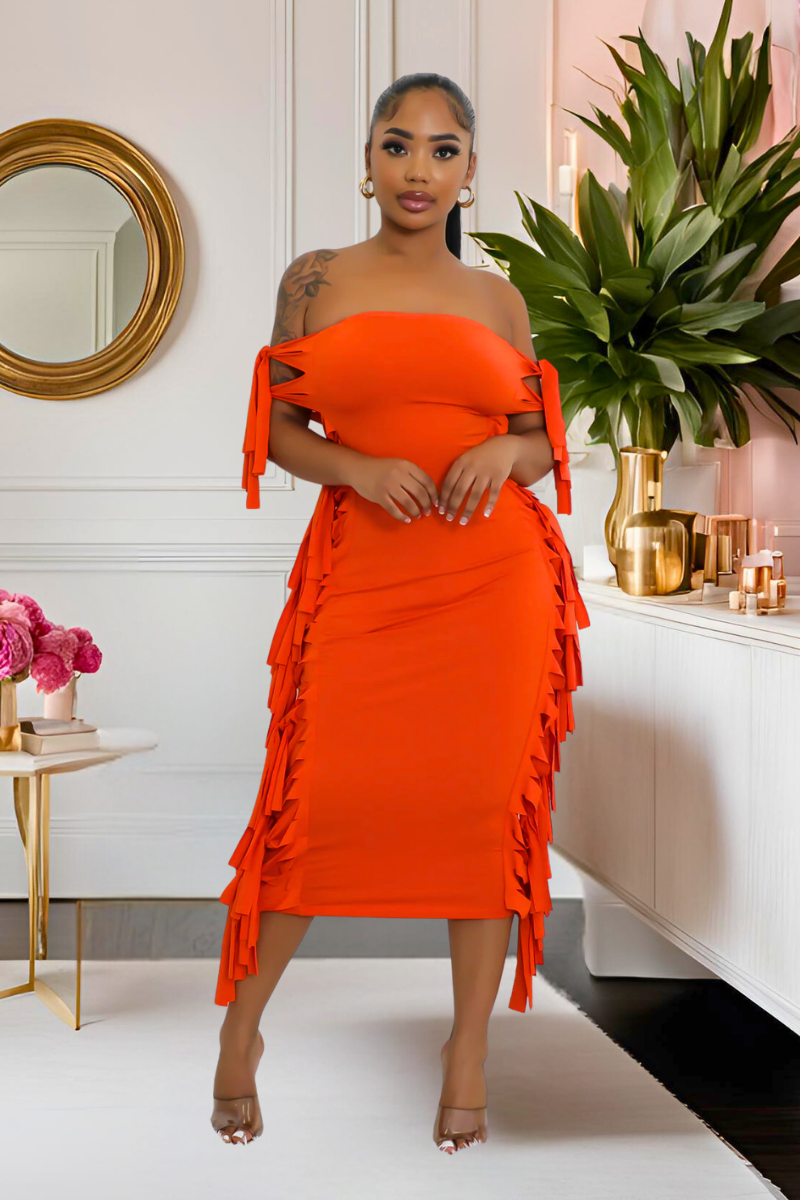 Bring the heat and leave no questions. The Turn Up the Heat Midi hugs every curve while serving drama with cascading side tassels and flirty off-shoulder ties. Perfect for rooftop nights, birthdays, or when you just feel too good not to be seen. The color? Unapologetically bold—and yes, it comes in more than one.